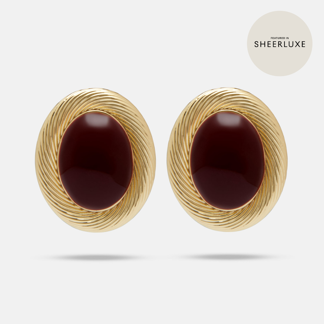 Introducing Amie Bordeaux, a limited edtion colourway. The epitome of Parisian-inspired luxury. These stunning earrings feature a black enamel design with 18-carat gold plating, giving them a vintage feel. Not only are they incredibly light weight, but they also make a chic statement that will elevate any outfit.